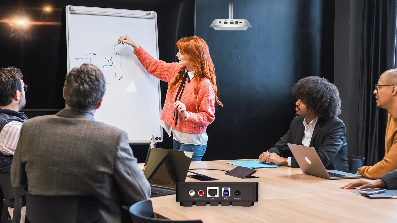 The ProHUB-22MM offers up to 30 meters of power and data transmission via RJ45, simplifying wiring for large setups. It ensures reliable connections with the ProMIC-22MM and other devices. USB and AUX interfaces enable seamless integration with communication and recording systems