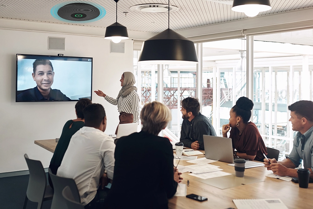 and 360-degree voice pickup, ensuring that every participant’s voice is captured clearly—whether they’re in a small huddle room or a large boardroom.